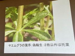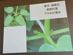 輪生、などがあります。右のアカネの葉は同じところから4枚出ていて輪生に見えますが2枚が本当の葉、2枚が葉間托葉で偽輪生だそうです。