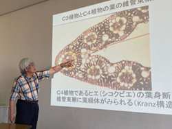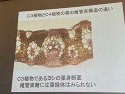 写真が小さいので良く見えませんが、左のC3植物(ヨシ)の維管束の中には葉緑素はありませんが、右のC4植物(ヒエ)は先生が指さしているい部分に葉緑素があります。 |