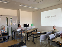 今月は前田先生をお招きして生物学の講義をしていただきました。先生は環境庁環境カウンセラーとして環境調査、指導者対象の講座、子供たち対象の観察会を行うなど、様々な方面で活躍されています。また野生生物を調査研究する会で出版している冊子の編集にも携わっておられます。 |