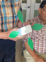 これは先生が子供たちに植物の葉の役割や付き方を教えたるためのものです。発泡スチロールを茎に見立て、針金の付いた葉を刺していき葉の付き方を確認。葉序(葉の付き方)には互生、対生、十字対生、 輪生、などがあります。右のアカネの葉は同じところから4枚出ていて輪生に見えますが2枚が本当の葉、2枚が葉間托葉で偽輪生だそうです。 |