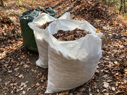 | さてこの落ち葉ですが、集めて下の畑の畝に載せていきます。先生が菌ちゃん農法の畝をまた新しく作られたのですが・・・大きな袋に3つほど。 | |