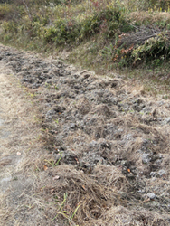 最期に横の溝の土を掘って上にかぶせて行きます。やっと畝が完成!最期の土をかぶせる作業のほとんどは先生が・・・。雨が掛からない方が良いのでマルチをした方が良いのですが、ここにかぶせるとなると大きなビニールが必要かもしれません。 |