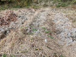 | 最近先生が作られた畝(写真:左)、良く耕してあると思うでしょう?実はイノシシたちが耕してくれたんだそうです。畝をさらに掘り返してぐちゃぐちゃに〜ところが一番最初に作った畝(写真:右)の方は上を歩いた足跡があるんですが、掘っていない。その両側の溝には掘り返した跡がありますが。 | |
