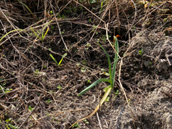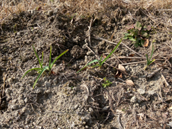 | 古い畝の方には今ニンニクが植わっていて、イノシシに食べられもせず(匂いが嫌い?)すくすく育っています。 |